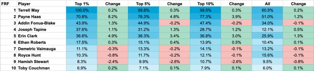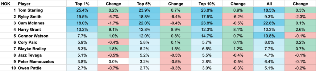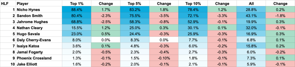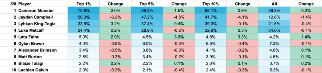 The tables below sets out the proportion of Supercoach teams in the top 1%, top 5%, top 10% and overall that own each player.