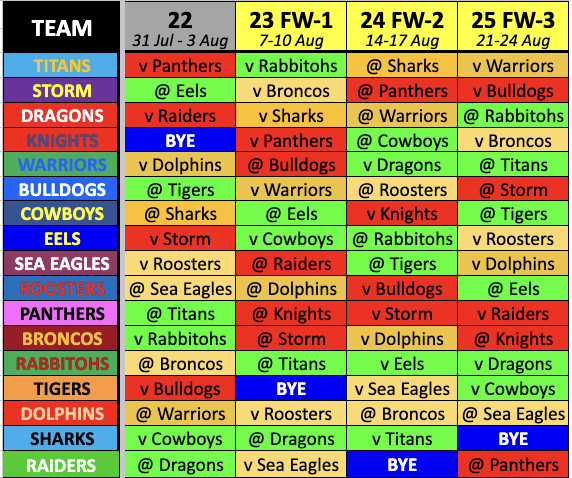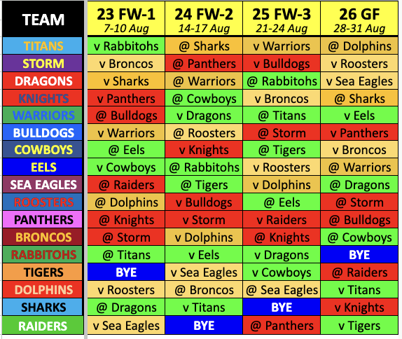 The advice below covers a four week stretch of games. And a lot of Coaches out there will just be pushing to MAKE your finals. So make sure you understand any recommendations below are made in isolation with a view of finals – if you want more detail on the best draws in the fun into H2H finals, check out last week’s article.
