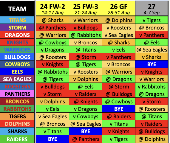 Serious H2H players know the true secret advantage to winning your league is your finals strength of schedule. Because while the overall difference in points over a whole season is crucial, in a H2H finals format, it all boils down to just four weeks of matchups.