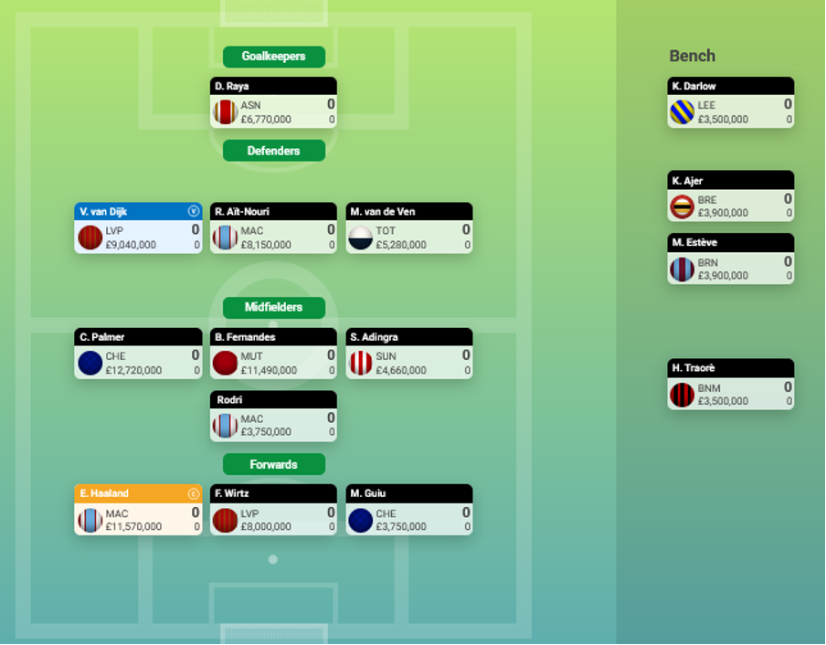 I’ve opted for 3-4-3 and what should be the best defence in the league in the keeper position with Arsenal’s David Raya, so I won’t have to worry about fixtures or trading in this position for the season unless he gets injured.