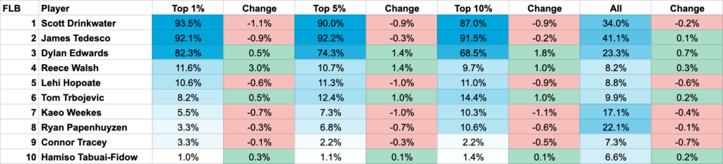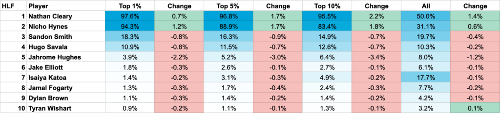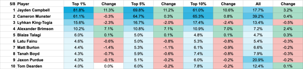 The tables below sets out the proportion of Supercoach teams in the top 1%, top 5%, top 10% and overall that own each player.