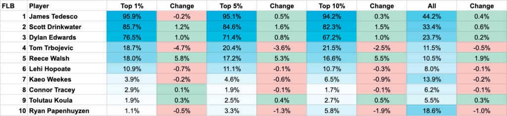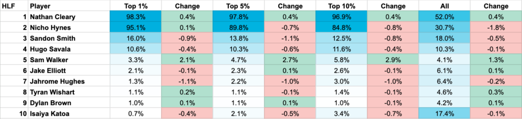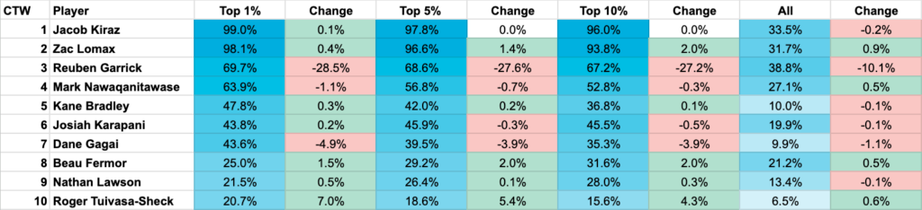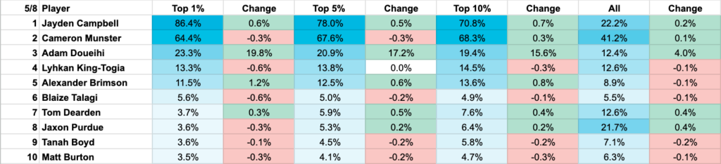 The tables below sets out the proportion of Supercoach teams in the top 1%, top 5%, top 10% and overall that own each player.