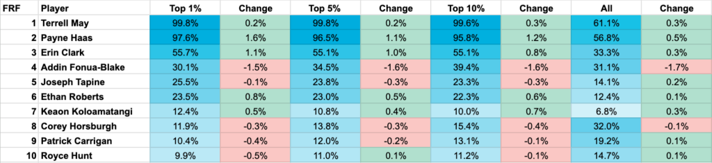 No major ownership changes in the 2RF column, with most putting out their Reuben Garrick fires by bringing in a CTW.