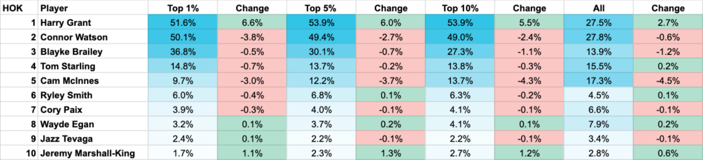 Harry Grant has risen to the most popular hooker option this week, with Blayke Brailey on the bye and Connor Watson playing limited minutes off the bench.