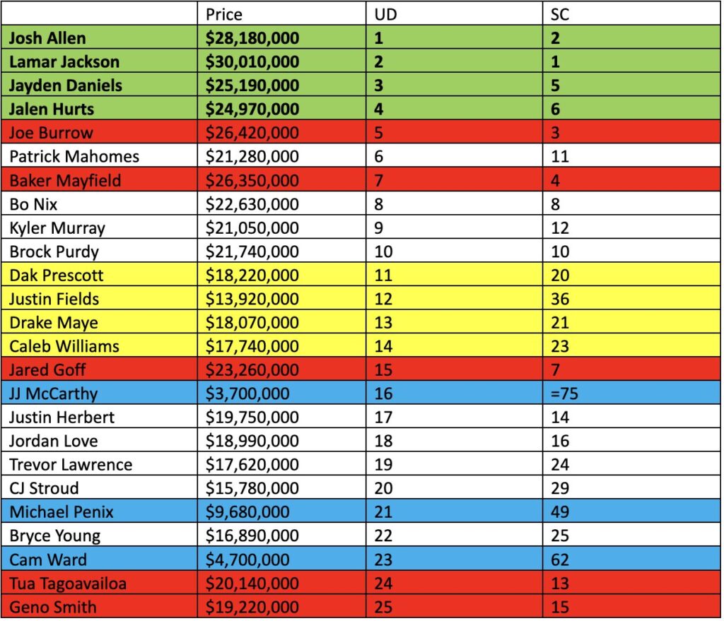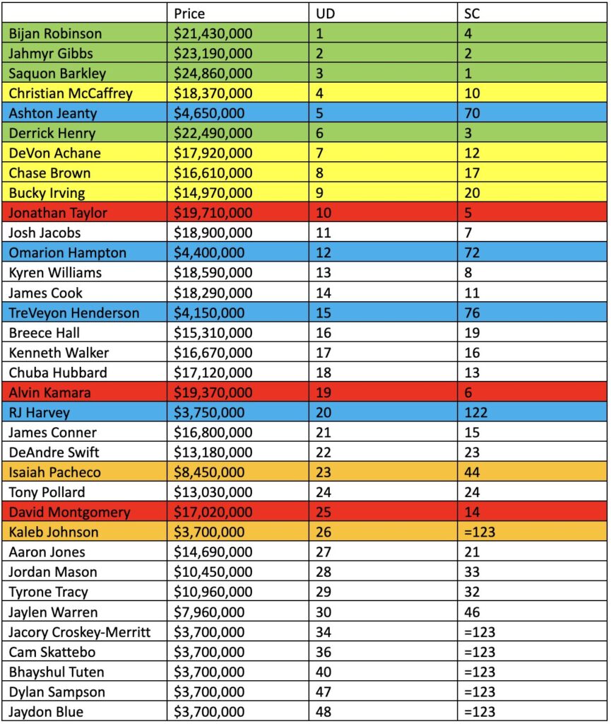 Now let’s go through position-by-position, comparing UD ADPs vs SC starting prices to see where we can find some value.