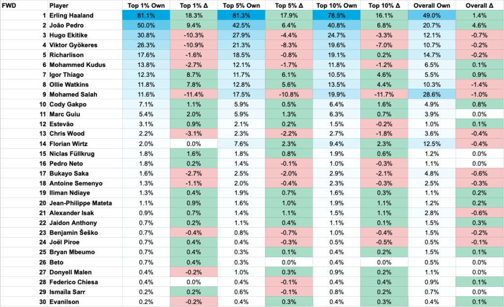Erling Haaland has increased his ownership in the top 1%, following a 14-point performance vs Brighton.