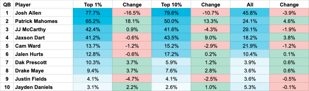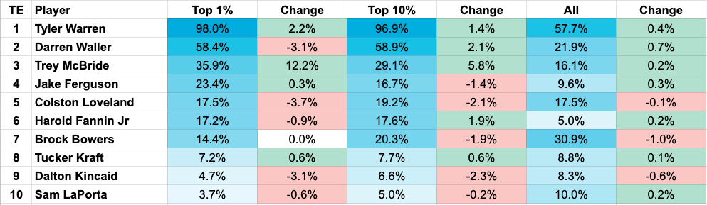 Tyler Warren remains the most owned player for the top 1% of teams, following his second 30+ score in 3 games.