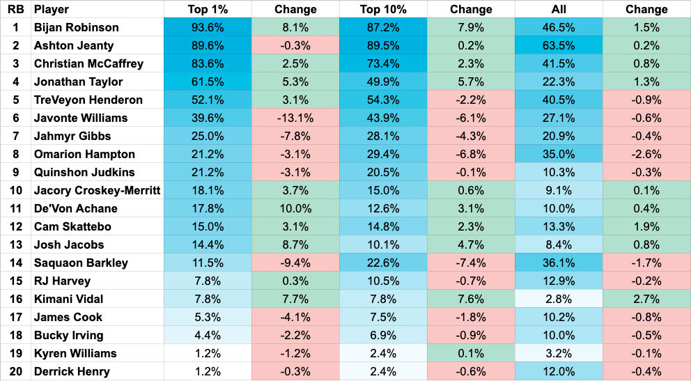 Bijan Robinson cemented his spot as the most owned running back in Supercoach for the top 1% of teams, with an outrageous 170 rush yards, 68 receiving yards, and a rushing TD against the Bills last week.