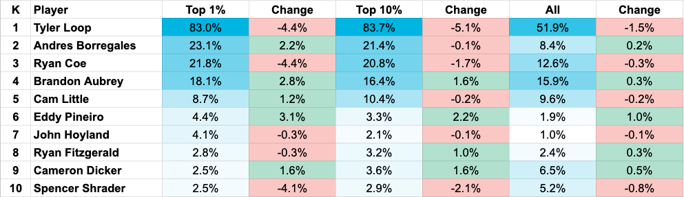 The tables below set out the proportion of Supercoach teams in the top 1%, top 10% and overall that own each player.
