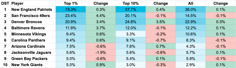 The most owned kicker, Tyler Loop, is on the bye this week and is the 8th for traded-out player.