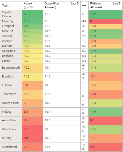Outperformed their easy fixtures (-0.6), but that upcoming run is brutal (12.4 npxG).