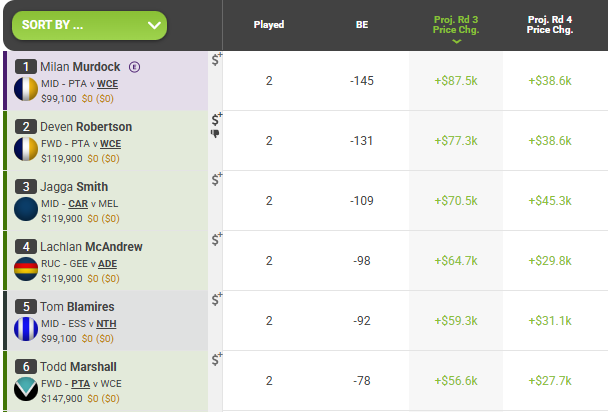 Everyone listed in the above snippet from the Supercoach player database is a must have (except Murdock, more on this later…) as they’ll all make bulk cash from very low starting prices. Prioritise these guys before reading on, but hopefully you started them all.